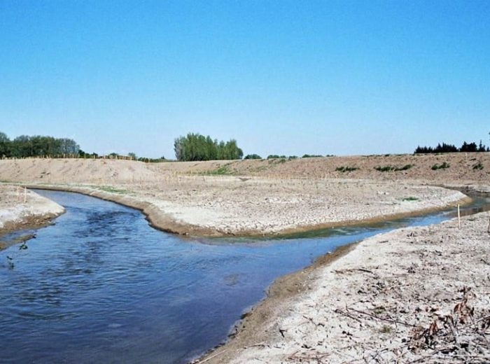 A Bouillargues, l’opportunité foncière d’anciens bassins de lagunage communaux désaffectés (5 ha) et la motivation du domaine du moulin Gazay de rendre à la rivière son air d’autrefois (celui de la belle époque quand les Nîmois venaient canoter sur le Vistre), ont dicté un projet différent sur lequel le cours canalisé est abandonné et comblé au profit d’un nouveau lit sinueux (2 km).