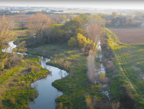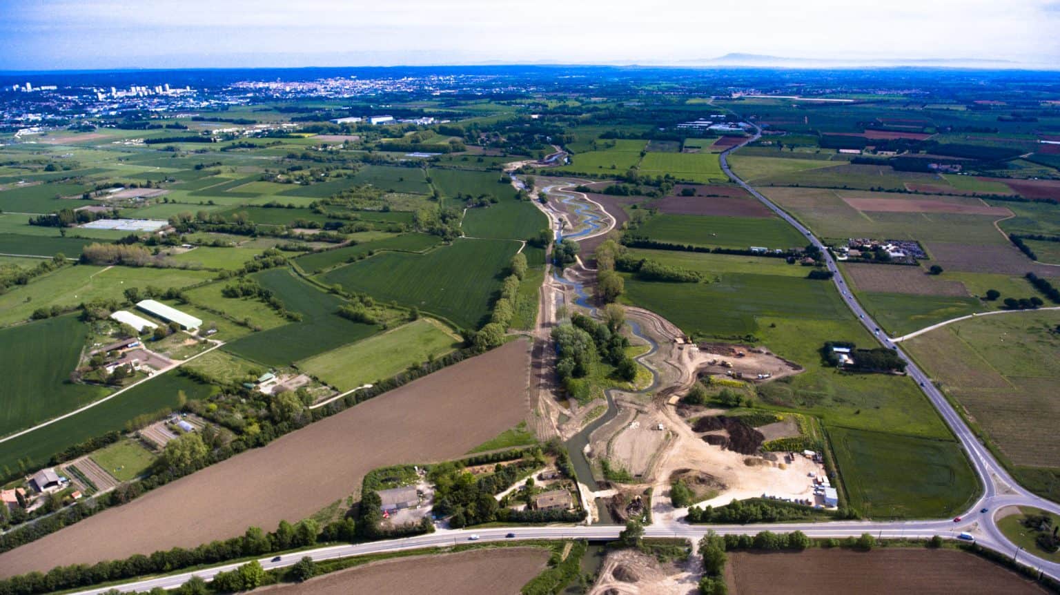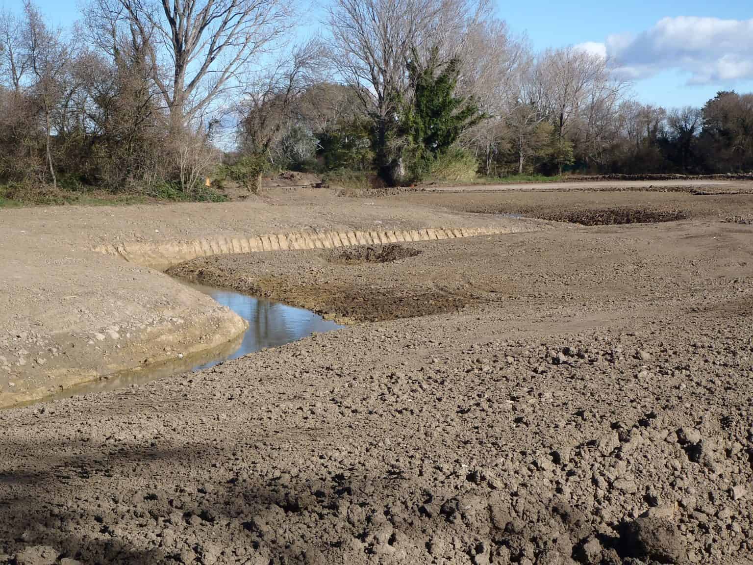 Printemps 2016 : les travaux à Milhaud (ancien lit rectiligne à gauche, nouveau lit sinueux à droite) – photo AGORA Communication