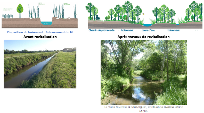 En engageant des travaux de revitalisation, il s’agit de réparer les dégradations des fonctions des cours d’eau, dégradations engendrées par les aménagements successifs (voir La petite histoire illustrée du Vistre).