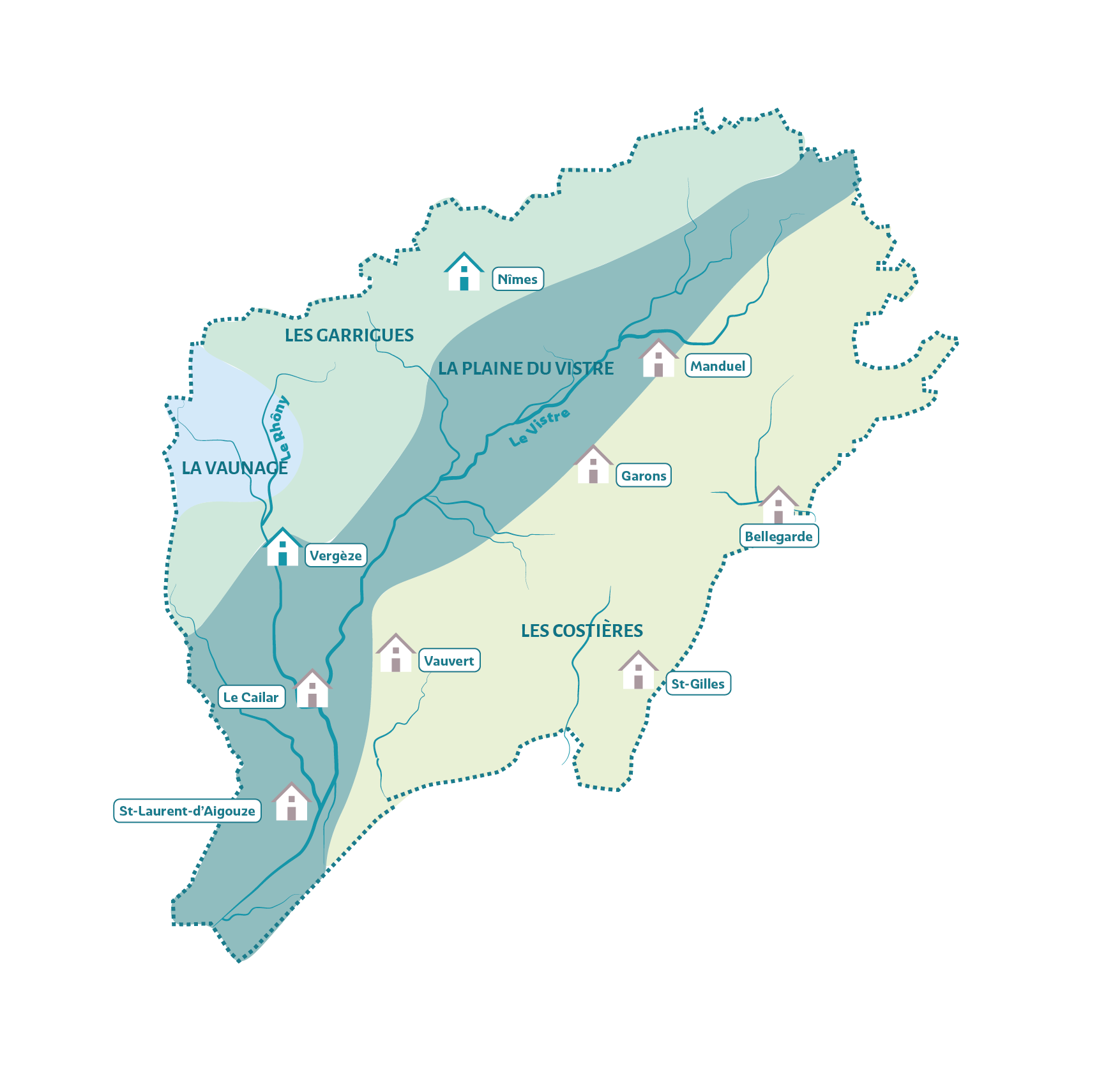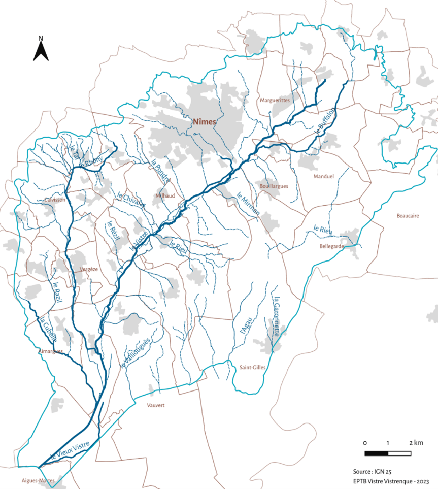 Le territoire de l’établissement public territorial de bassin Vistre Vistrenque correspond au bassin versant du Vistre et de ses affluents : Rhôny, Cubelle, Buffalon, Canabou, pour les principaux.