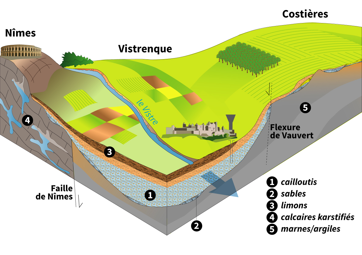 Les nappes de la Vistrenque et des Costières ne sont ni une rivière ni un lac souterrain, concepts exceptionnellement rares dans la nature mais qui habitent pourtant l’imaginaire collectif. Contenues dans un réservoir de sables, cailloux et graviers, l’eau imprègne tous les espaces libres, à la manière d’une éponge, et forme ainsi une nappe. Ce réservoir d’une épaisseur de 5 à 25 mètres repose sur des marnes imperméables. L’eau s’y accumule et s’écoule à travers ces roches. Proches de la surface, ces nappes sont facilement accessibles.