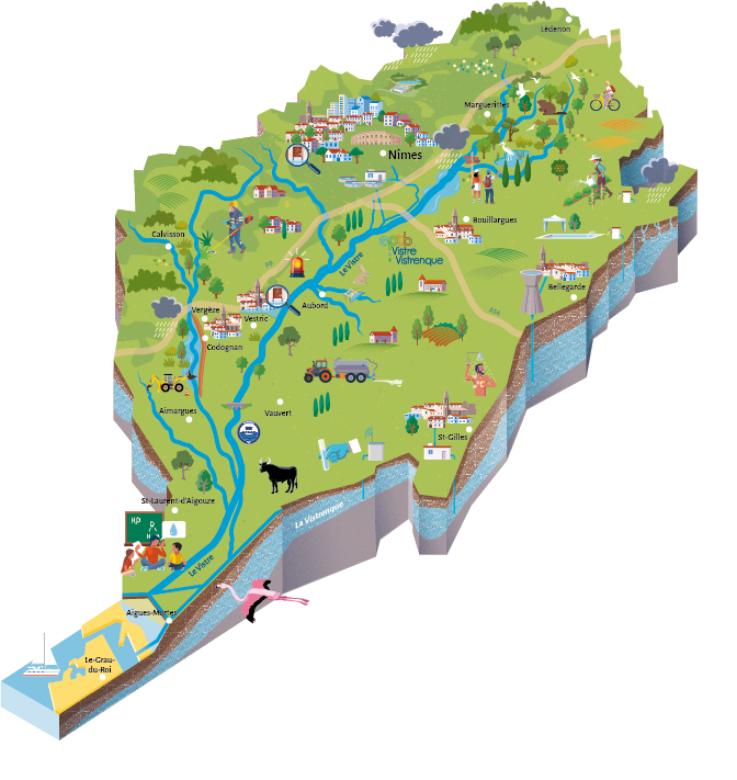 Nous sommes l’acteur public local intervenant sur le bassin versant du Vistre et des nappes Vistrenque et Costières, dans le sud du département du Gard.